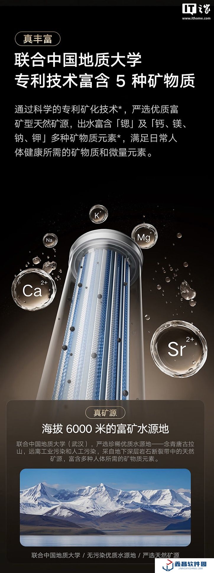 該凈水器配備的濾芯同時(shí)含有鍶、鈣、鎂、鈉、鉀共計(jì) 5 種礦物質(zhì),使用天然礦源,滿足日常人體健康所需的礦物質(zhì)和微量元素,鍶含量穩(wěn)定,出水鍶含量≥0.2mg / L,達(dá)到礦泉水級(jí)水質(zhì)。