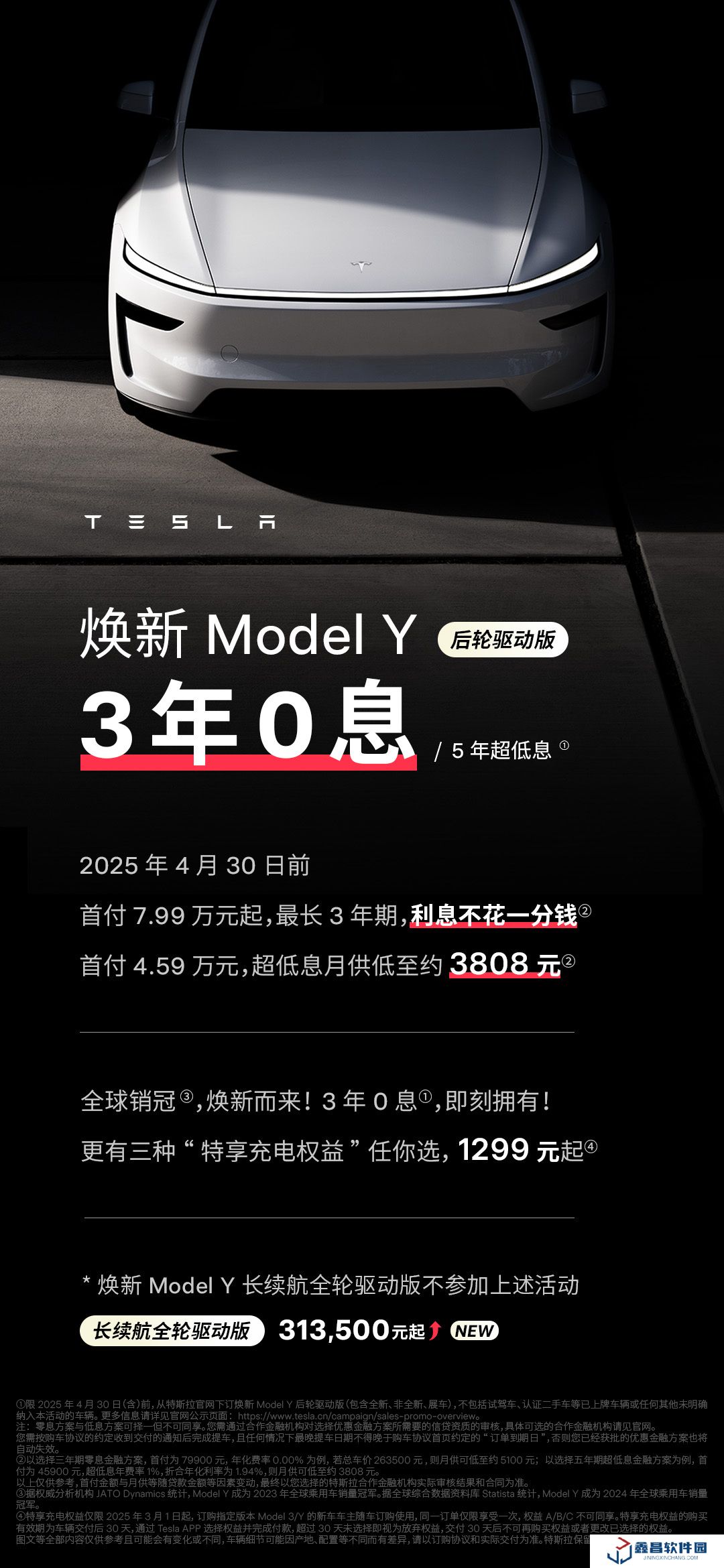 特斯拉宣布在 4 月 30 日前為煥新 Model Y 后輪驅(qū)動版推出 3 年 0 息和 5 年超低息政策,月供最低 3808 元。Model 3 限時保險補貼將于 3 月 31 日結(jié)束,在那之前提車全系現(xiàn)車補貼 8,000 元。