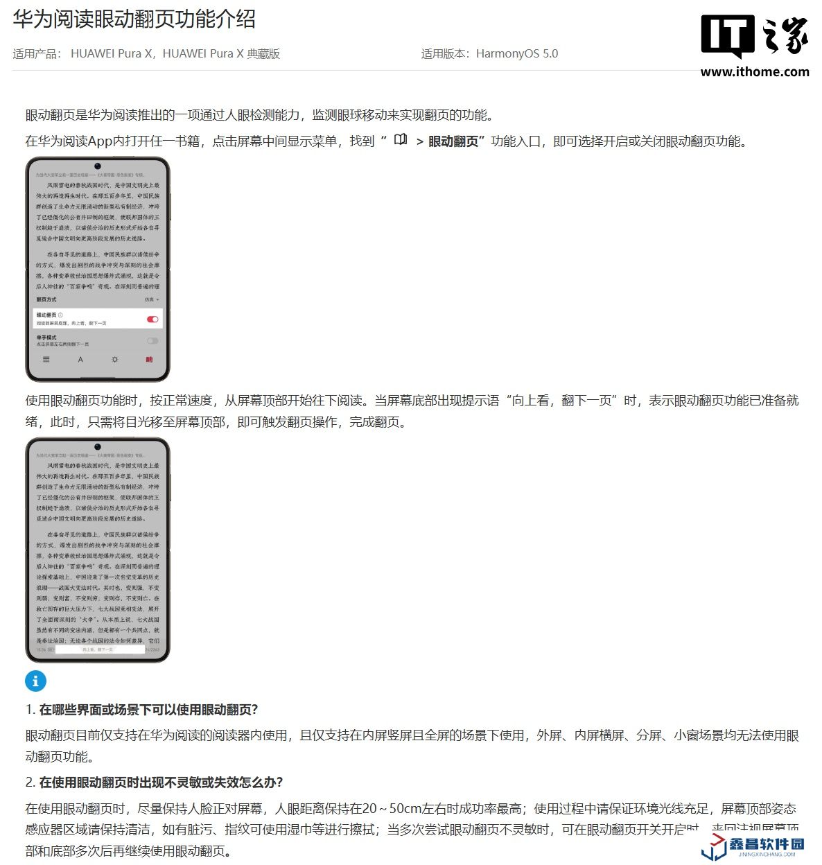 華為 Pura X 系列闊折疊手機還帶來了眼動翻頁功能,官網(wǎng)詳情頁顯示:眼動翻頁是華為閱讀推出的一項通過人眼檢測能力,監(jiān)測眼球移動來實現(xiàn)翻頁的功能。