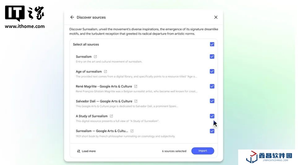 點(diǎn)擊該按鈕后,會(huì)出現(xiàn)一個(gè)帶有“您感興趣的是什么?”提示的文本框。用戶只需在文本框中描述自己想要查找的內(nèi)容,越具體越好,然后點(diǎn)擊提交按鈕。NotebookLM 將在幾秒鐘內(nèi)搜索數(shù)百個(gè)潛在的網(wǎng)絡(luò)資源,對(duì)它們進(jìn)行分析,并根據(jù)用戶的話題篩選出最相關(guān)的資料。最終,它會(huì)整理出一份最多包含 10 個(gè)推薦資料的列表,并附上解釋其相關(guān)性的摘要。用戶可以勾選想要導(dǎo)入筆記本的資料,然后點(diǎn)擊導(dǎo)入按鈕。