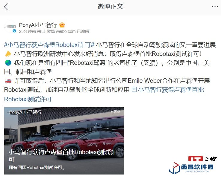 本站 4 月 3 日消息,小馬智行今日宣布獲得由盧森堡交通與公共工程部(Luxembourg"s Ministry of Mobility and Public Works)頒發(fā)的 Robotaxi 測試許可,成為首批獲準在當?shù)亻_展路測的企業(yè)。