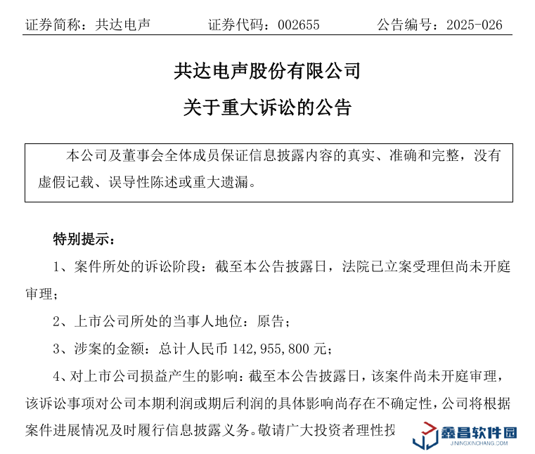 上述三個(gè)案件的訴訟金額目前總計(jì)人民幣 142955800 元(約 1.43 億元),占共達(dá)電聲最近一期經(jīng)審計(jì)凈資產(chǎn) 21.31%。對(duì)于該訴訟對(duì)上市公司的影響,上述證券部人士表示:“如果這個(gè)官司打贏了,對(duì)方不提起二審或者其他,可能未來(lái)會(huì)給公司帶來(lái)營(yíng)業(yè)外的收入?!?/p>