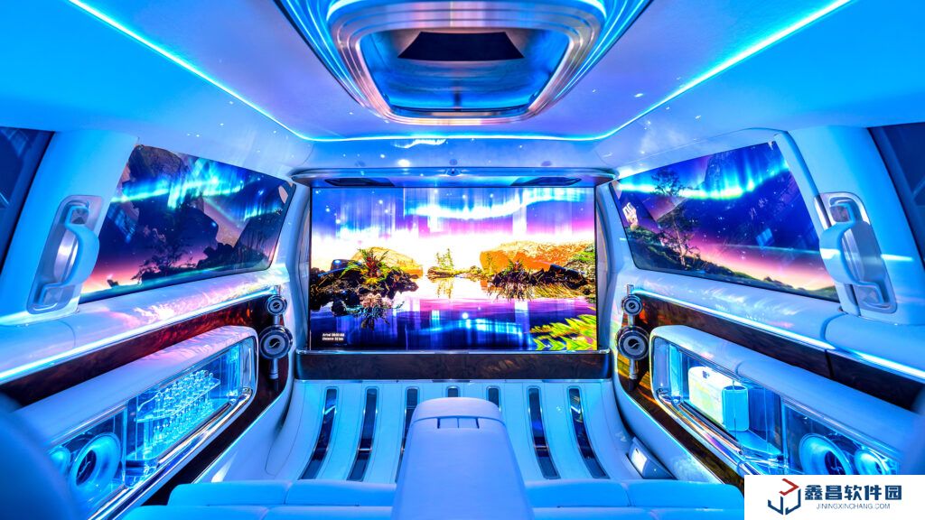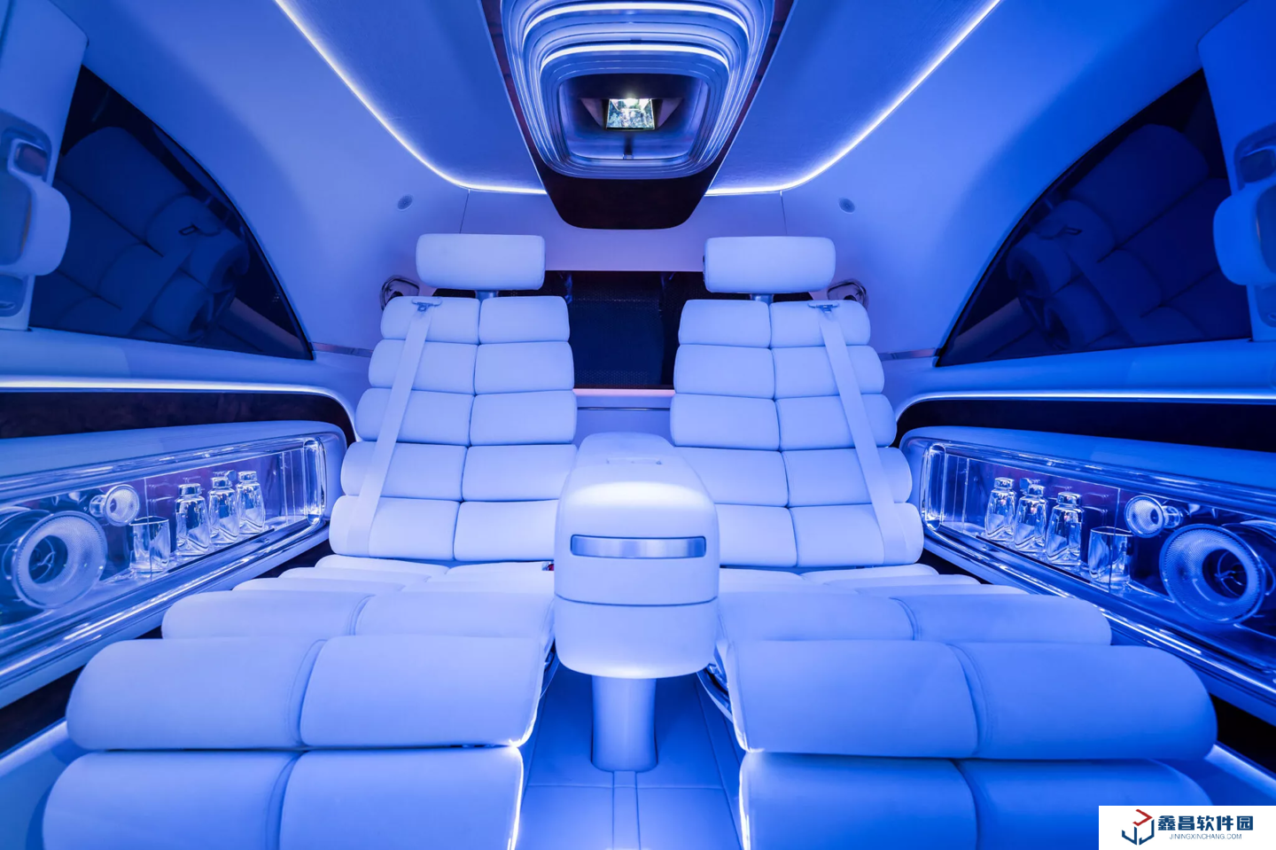 乘客上車時,一塊 65 英寸 4K 巨幕從地板升起,搭配 42 個揚(yáng)聲器和七個投影儀,甚至能將車窗化為額外投影面,打造 360 度沉浸式觀影體驗。