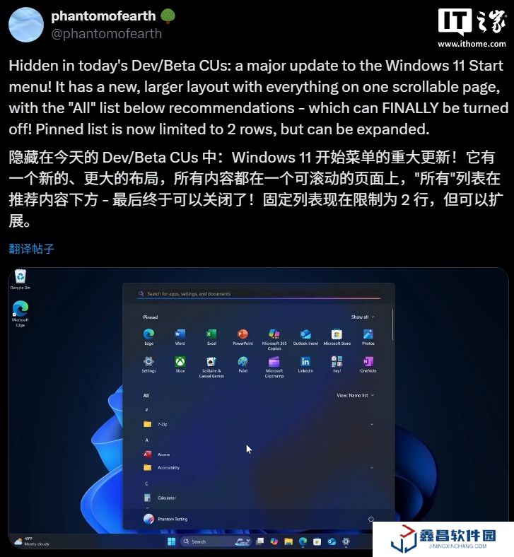 微軟 Win11 開始菜單重大更新:在一頁顯示固定圖標(biāo)和所有應(yīng)用,推薦項可徹底關(guān)閉