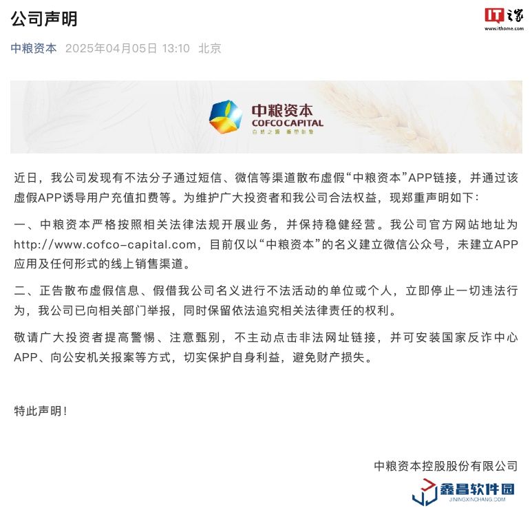 中糧資本:不法分子散布虛假 App 鏈接,公司已向相關(guān)部門舉報