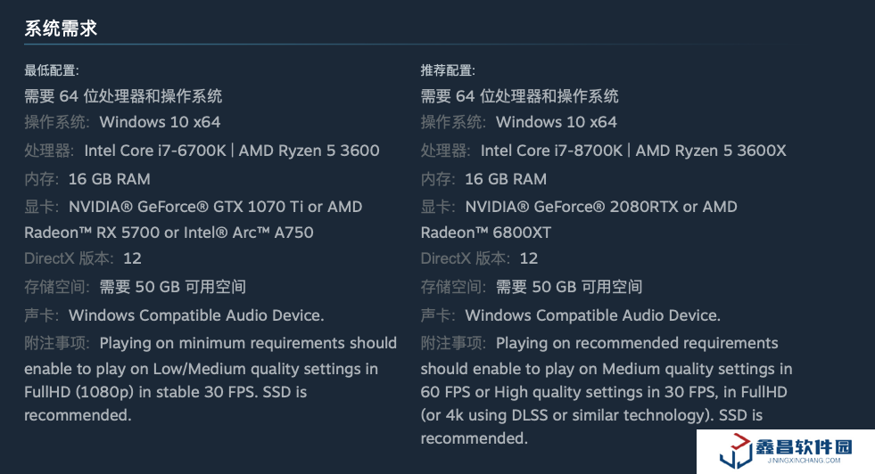 附注事項:滿足最低配置時,游戲可在性能模式設(shè)置下以 30 幀,720P 運行。建議使用 SSD 硬盤。