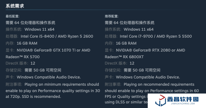 附注事項:滿足推薦配置時,游戲可在性能模式下以 60 幀,1080P 畫質(zhì)運行;或在畫質(zhì)模式下以 30 幀運行(借助 DLSS 等技術(shù)可達 4K 分辨率)。需配備固態(tài)硬盤。