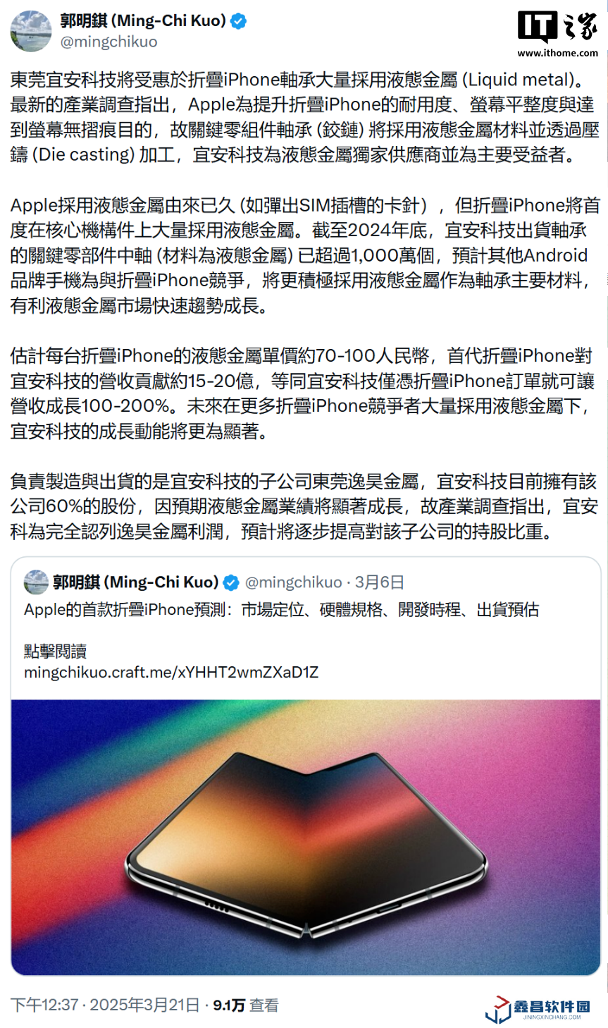 分析師郭明錤昨日(3 月 21 日)發(fā)文稱,蘋果公司為提升折疊 iPhone 的耐用性、屏幕平整度以及實(shí)現(xiàn)屏幕無(wú)折痕效果,決定在其關(guān)鍵零組件 —— 軸承(鉸鏈)中大量采用液態(tài)金屬材料,并通過(guò)壓鑄工藝進(jìn)行加工。