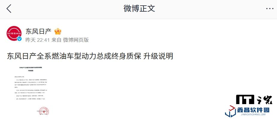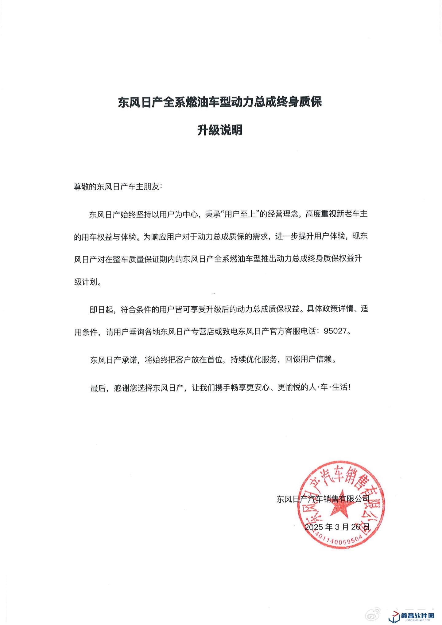 本站 3 月 27 日消息,東風(fēng)日產(chǎn)官方微博昨日晚發(fā)布升級說明,宣布東風(fēng)日產(chǎn)全系燃油車型動力總成升級終身質(zhì)保。