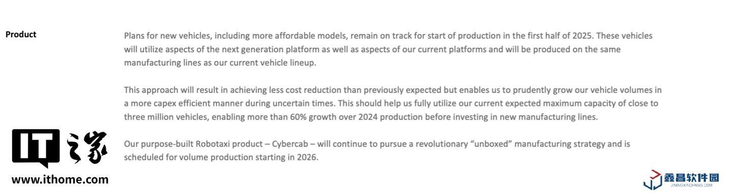 特斯拉稱(chēng),“包括更實(shí)惠車(chē)型在內(nèi)的新車(chē)型計(jì)劃仍按計(jì)劃進(jìn)行,將于 2025 年上半年開(kāi)始生產(chǎn)。這些車(chē)型將利用下一代平臺(tái)的一些方面以及我們當(dāng)前平臺(tái)的一些方面,并將與我們的當(dāng)前車(chē)型系列在同一生產(chǎn)線(xiàn)上生產(chǎn)。這種做法雖然會(huì)導(dǎo)致成本降低幅度低于之前的預(yù)期,但使我們能夠在不確定時(shí)期以更具資本效率的方式審慎地增加汽車(chē)產(chǎn)量。這應(yīng)該有助于我們充分利用當(dāng)前預(yù)計(jì)的近 300 萬(wàn)輛汽車(chē)的最高產(chǎn)能,使產(chǎn)量在投資于新生產(chǎn)線(xiàn)之前相比 2024 年增長(zhǎng) 60% 以上。我們專(zhuān)門(mén)打造的 Robotaxi 產(chǎn)品--Cybercab,將繼續(xù)追求革命性的“unboxed”制造策略,計(jì)劃于 2026 年開(kāi)始量產(chǎn)?!?/p>