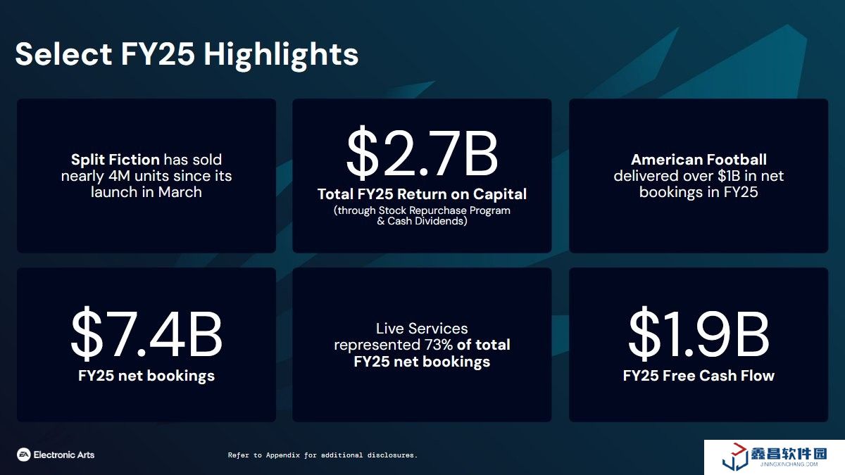 數(shù)據(jù)顯示,藝電 2025 財(cái)年凈收入達(dá) 74.63 億美元(去年同期 75.62 億美元),運(yùn)營(yíng)現(xiàn)金流 20.79 億美元(去年同期 23.15 億美元),全年股票回購(gòu)總額達(dá) 25 億美元。