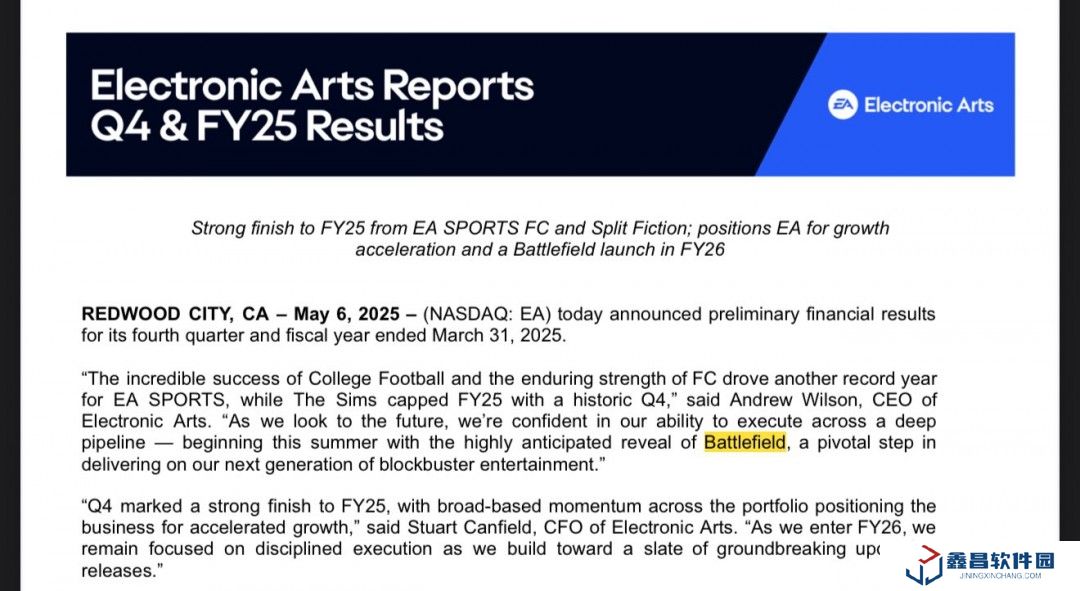 EA 2025 財(cái)年凈收入 74.63 億美元同比下滑 1.3%,《戰(zhàn)地》新作明年 4 月前發(fā)售