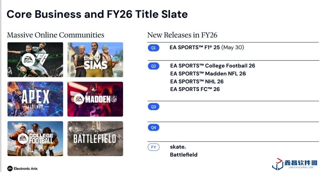 預(yù)計(jì)凈預(yù)定額 76-80 億美元,主力增長(zhǎng)來(lái)自 EA SPORTS、《模擬人生》及《戰(zhàn)地》《滑板》新作