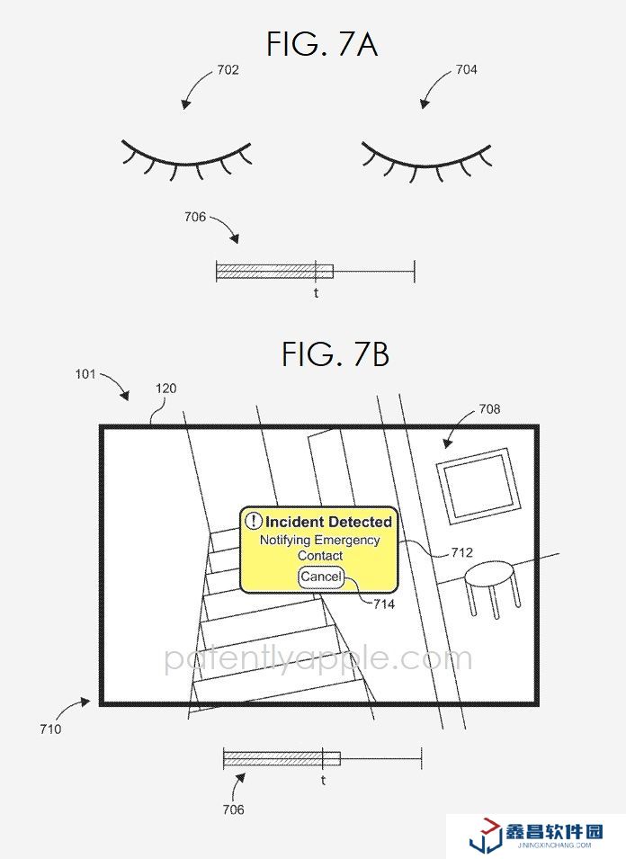 最新專利文件顯示,系統(tǒng)將適配 Vision Pro 等穿戴設(shè)備,通過(guò)頭顯內(nèi)置傳感器實(shí)時(shí)監(jiān)測(cè)用戶眼部狀態(tài)(如圖 7A 所示)。當(dāng)檢測(cè)到眼皮覆蓋眼球超 51%-100% 達(dá)設(shè)定時(shí)長(zhǎng)(如 30 秒),或伴隨血壓驟降等生物特征異常時(shí),即判定為意識(shí)喪失。