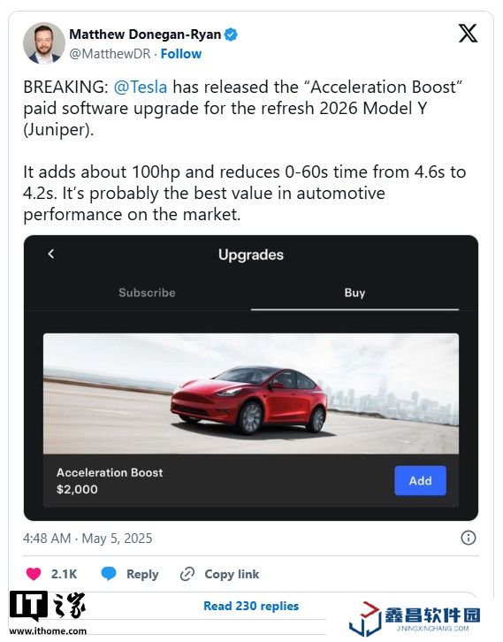本站 5 月 5 日消息,據(jù)長期關(guān)注特斯拉的車主兼投資者馬修?多恩根-瑞安(Matthew Donegan-Ryan)在 X 平臺上稱,特斯拉在美國為新款 Model Y 推出了一項名為“加速增強”(Acceleration Boost)的升級服務(wù)。該升級服務(wù)可通過特斯拉應(yīng)用程序以 2000 美元(本站注:現(xiàn)匯率約合 14467 元人民幣)的價格購買,能為該車增加約 100 馬力的動力,使其 0-60 英里(約 96.56 公里) / 小時的加速時間縮短至 4.2 秒。