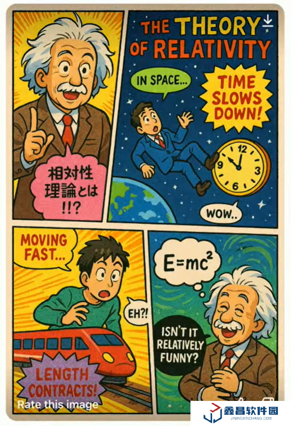 接下來(lái),他們讓模型畫出一幅描述相對(duì)論的漫畫,要求通俗易懂,還要加入一些幽默元素。