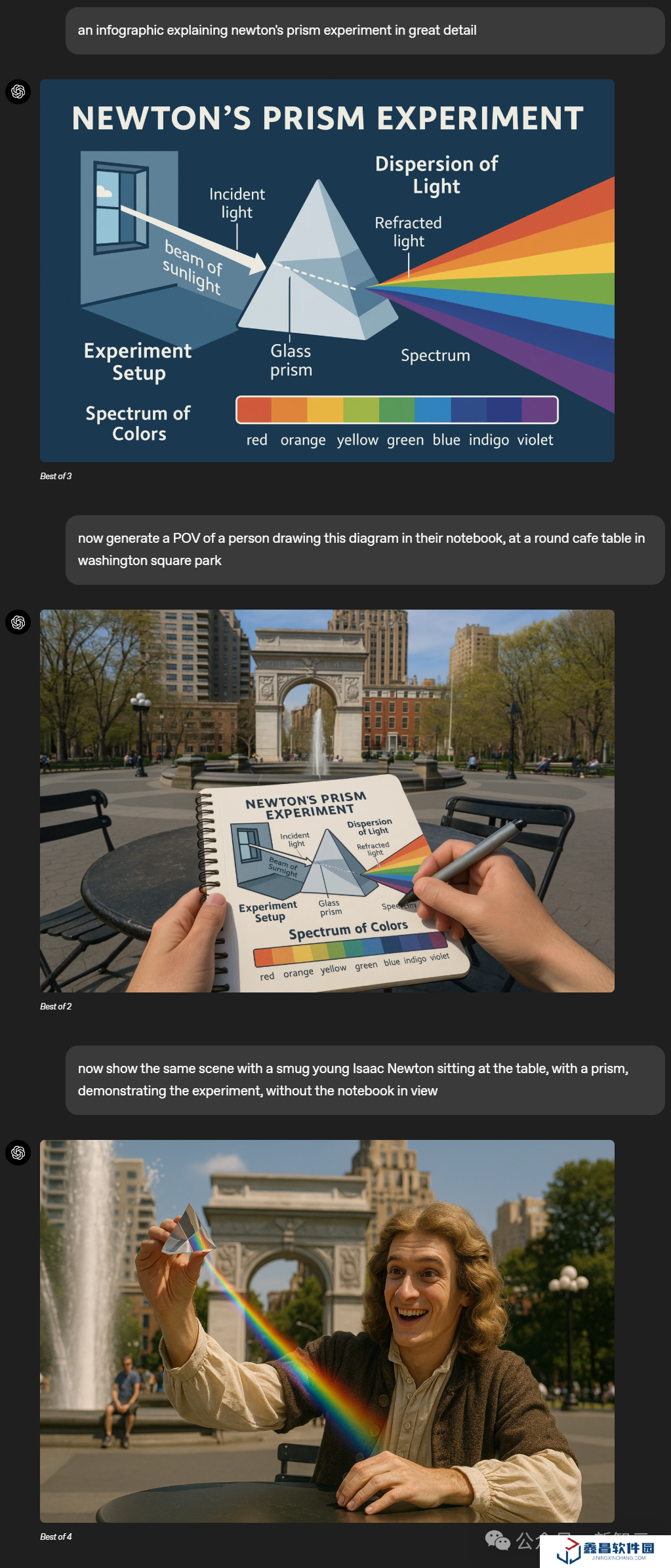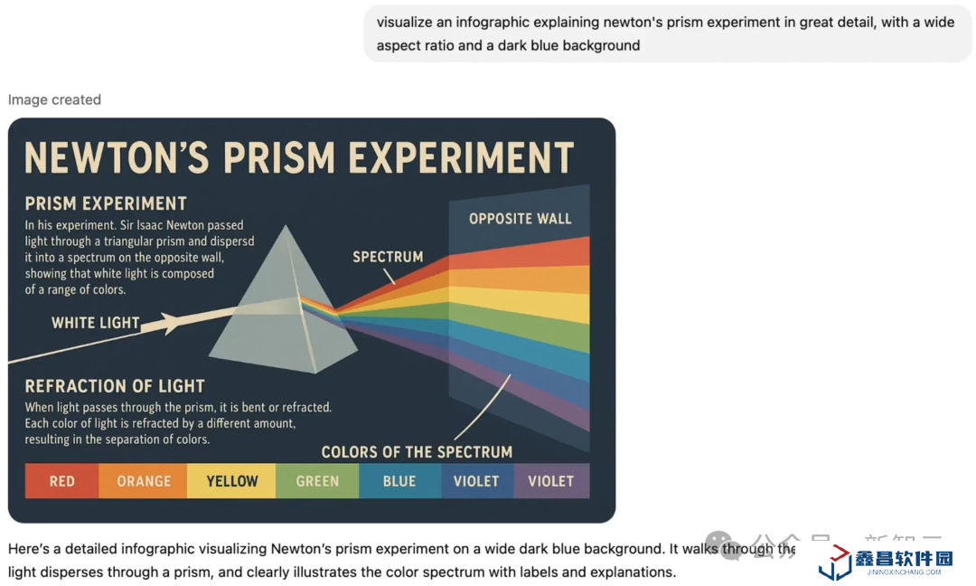 我們可以讓它設(shè)計(jì)一個(gè)信息圖,解釋牛頓的棱鏡寬高比,背景為深藍(lán)色。