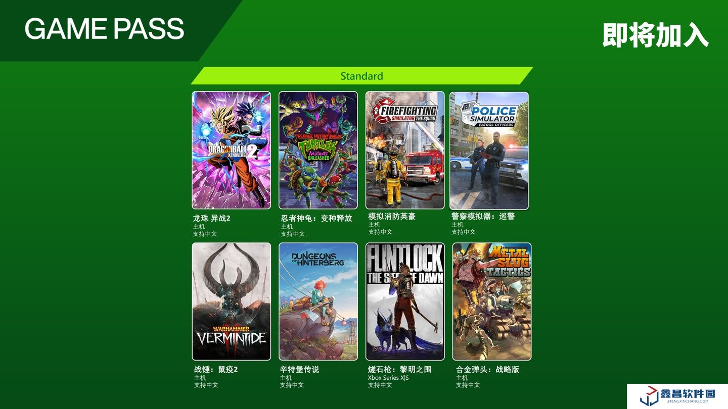 Game Pass Standard:《龍珠異戰(zhàn) 2》、《忍者神龜:變種釋放》、《模擬消防英豪》、《**模擬器:巡警》、《戰(zhàn)錘:鼠疫 2》、《辛特堡傳說》、《燧石槍:黎明之圍》、《合金彈頭:戰(zhàn)略版》