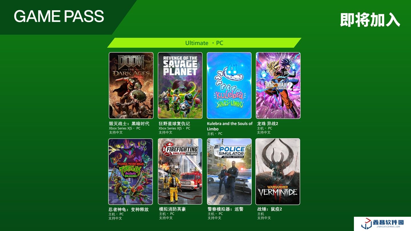 Game Pass Ultimate?PC:《毀滅戰(zhàn)士:黑暗時代》、《狂野星球復仇記》、《Kulebra and the Souls of Limbo》、《龍珠異戰(zhàn) 2》、《忍者神龜:變種釋放》、《模擬消防英豪》、《**模擬器:巡警》