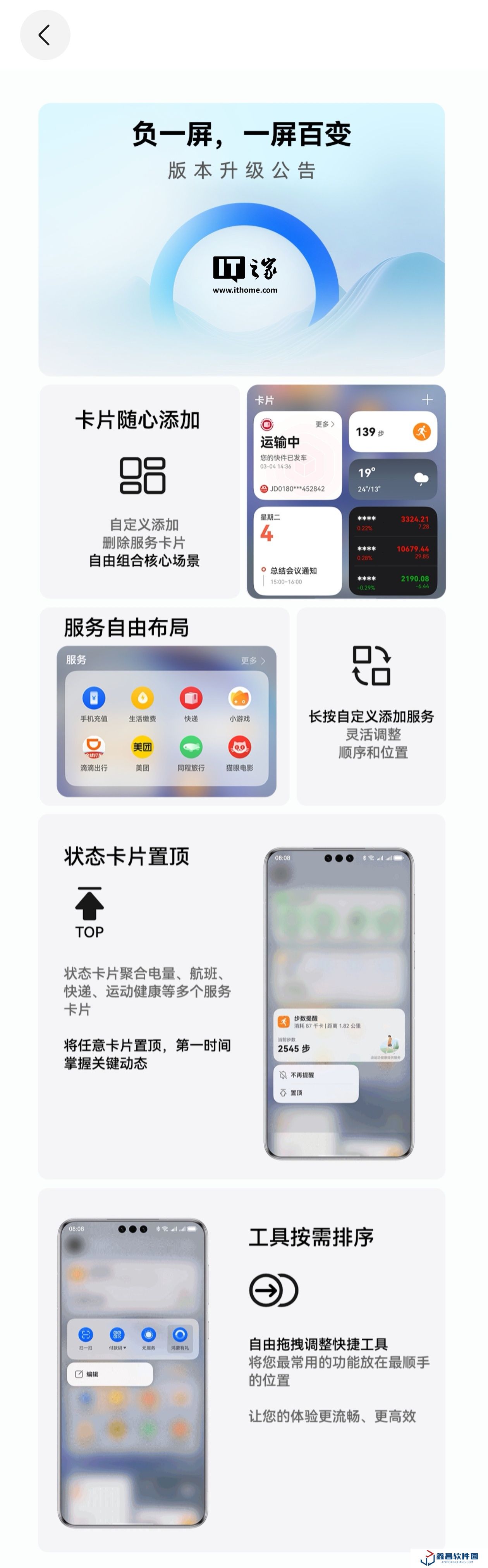 升級(jí)至“135”版本的機(jī)型已支持新版本“智慧助手?今天”App 的部分功能,包括:卡片添加、服務(wù)自由布局、狀態(tài)卡片置頂、工具按需排序等功能。遺憾的是,目前 12306 尚未完成負(fù)一屏的接入(該功能已做預(yù)告,預(yù)計(jì)后續(xù)版本支持),暫時(shí)僅支持綁定航旅縱橫。