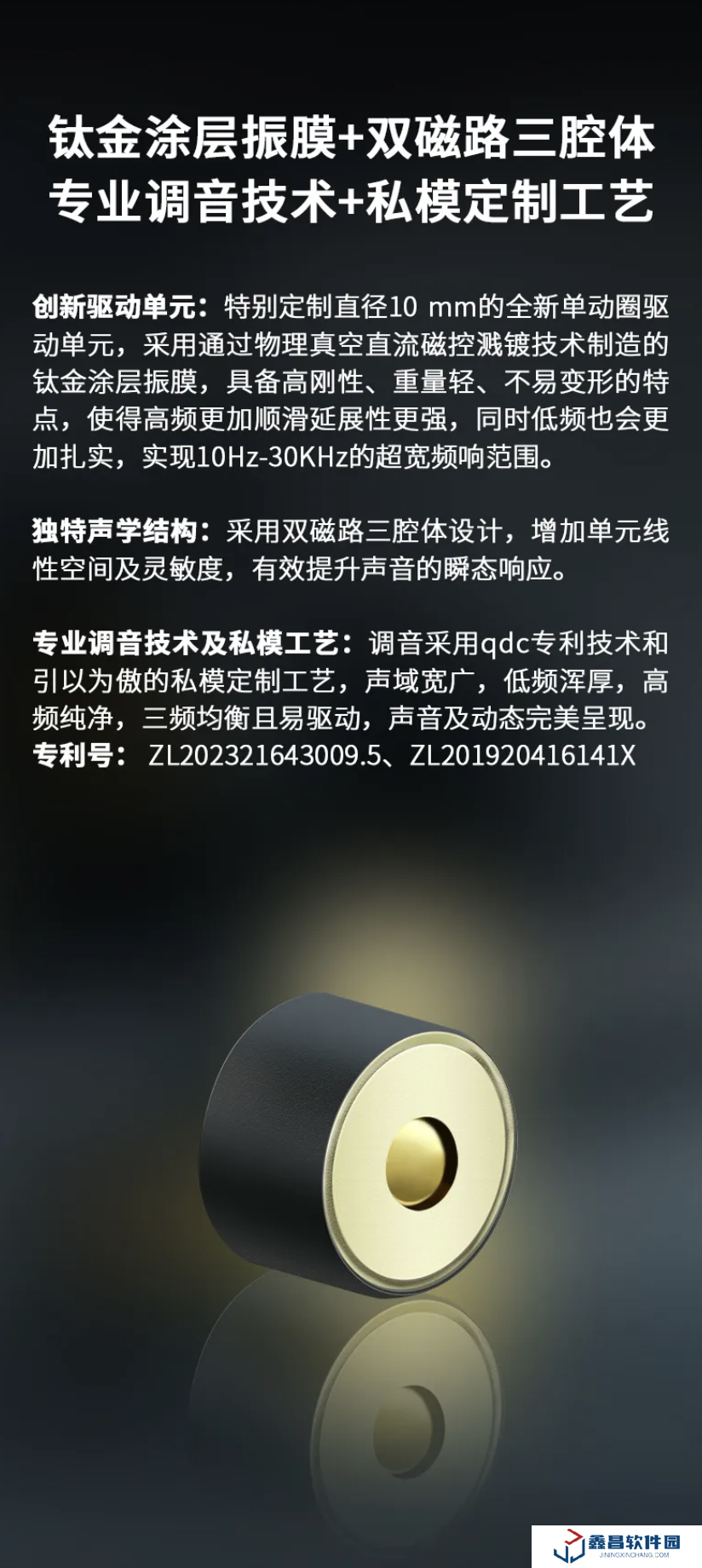 官方稱,相應耳機配備定制的10mm單動圈驅動單元,內置鈦金涂層振膜,可實現(xiàn)10Hz-30KHz頻響范圍。同時耳機采用雙磁路三腔體設計,可以增加單元線性空間,提升聲音的瞬態(tài)響應。