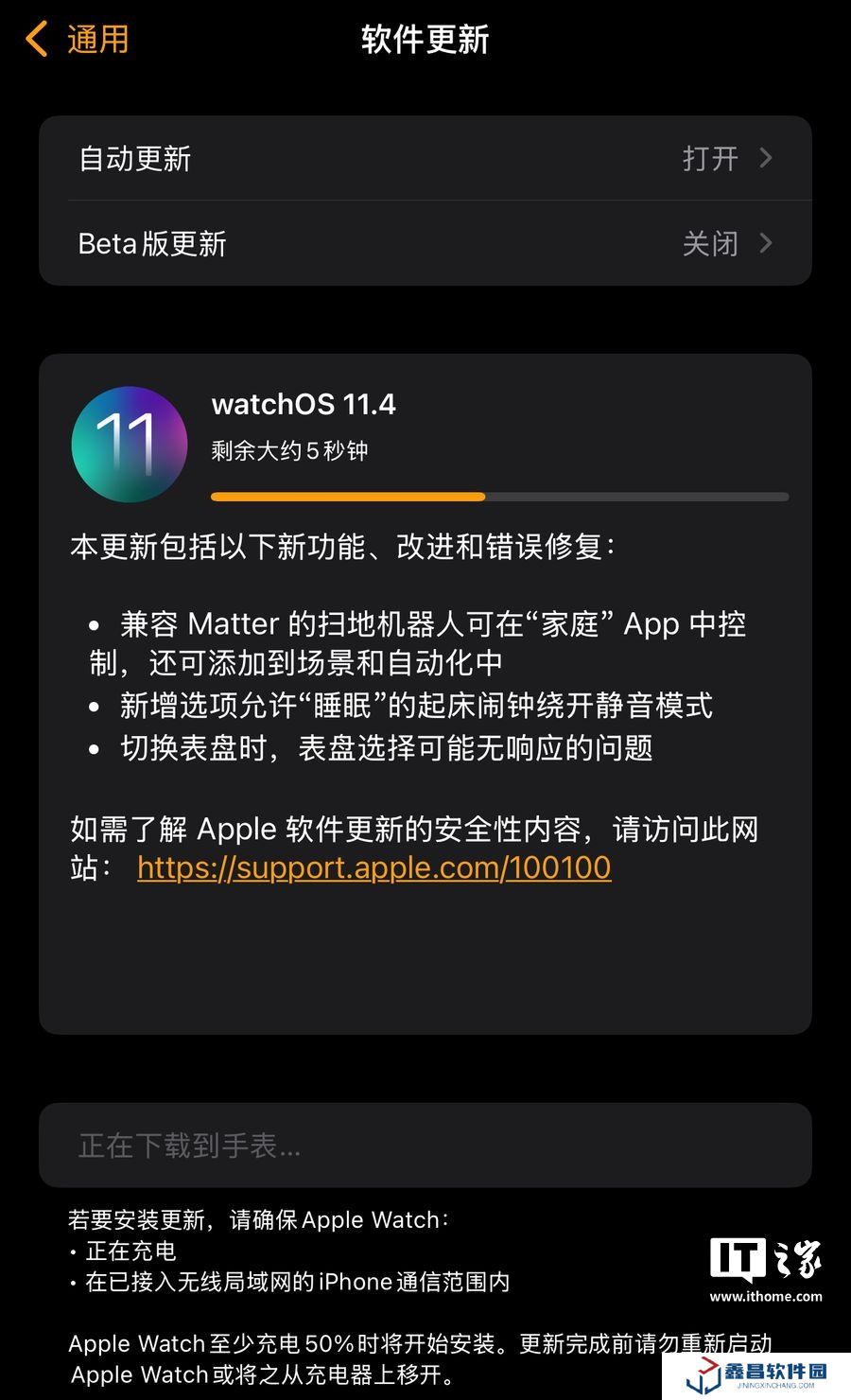 升級需確保 Apple Watch 電量≥50% 并連接 Wi-Fi:手表端通過設(shè)置-通用-軟件更新完成;iPhone 用戶需使用 Apple Watch 應(yīng)用操作。截至發(fā)稿,所有兼容 Apple Watch Series 4 及以上機(jī)型均可獲取該更新。
