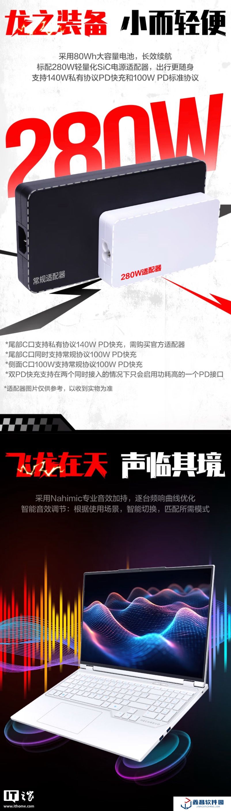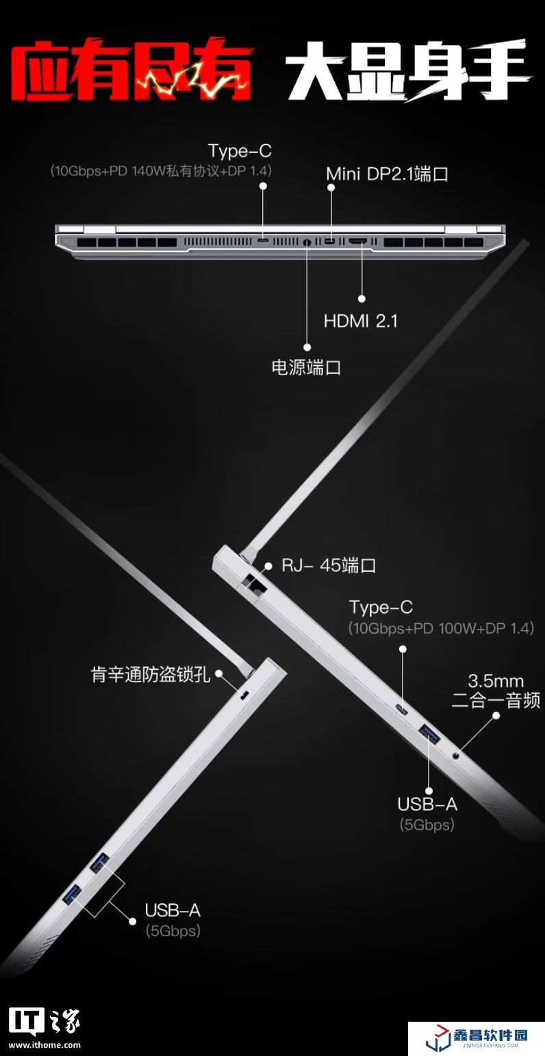 這款筆記本 A 面采用航空級鋁合金材質(zhì),帶有機(jī)械革命Logo,筆記本擁有Nahimic音效優(yōu)化,內(nèi)置80Wh電池(支持140W私有協(xié)議 PD 快充和100W PD標(biāo)準(zhǔn)協(xié)議),提供280W SiC電源適配器。