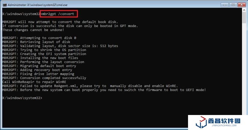 10.輸入“mbr2gpt /convert”,并按回車鍵,該命令將系統(tǒng)磁盤從 MBR 轉(zhuǎn)換為 GPT。
