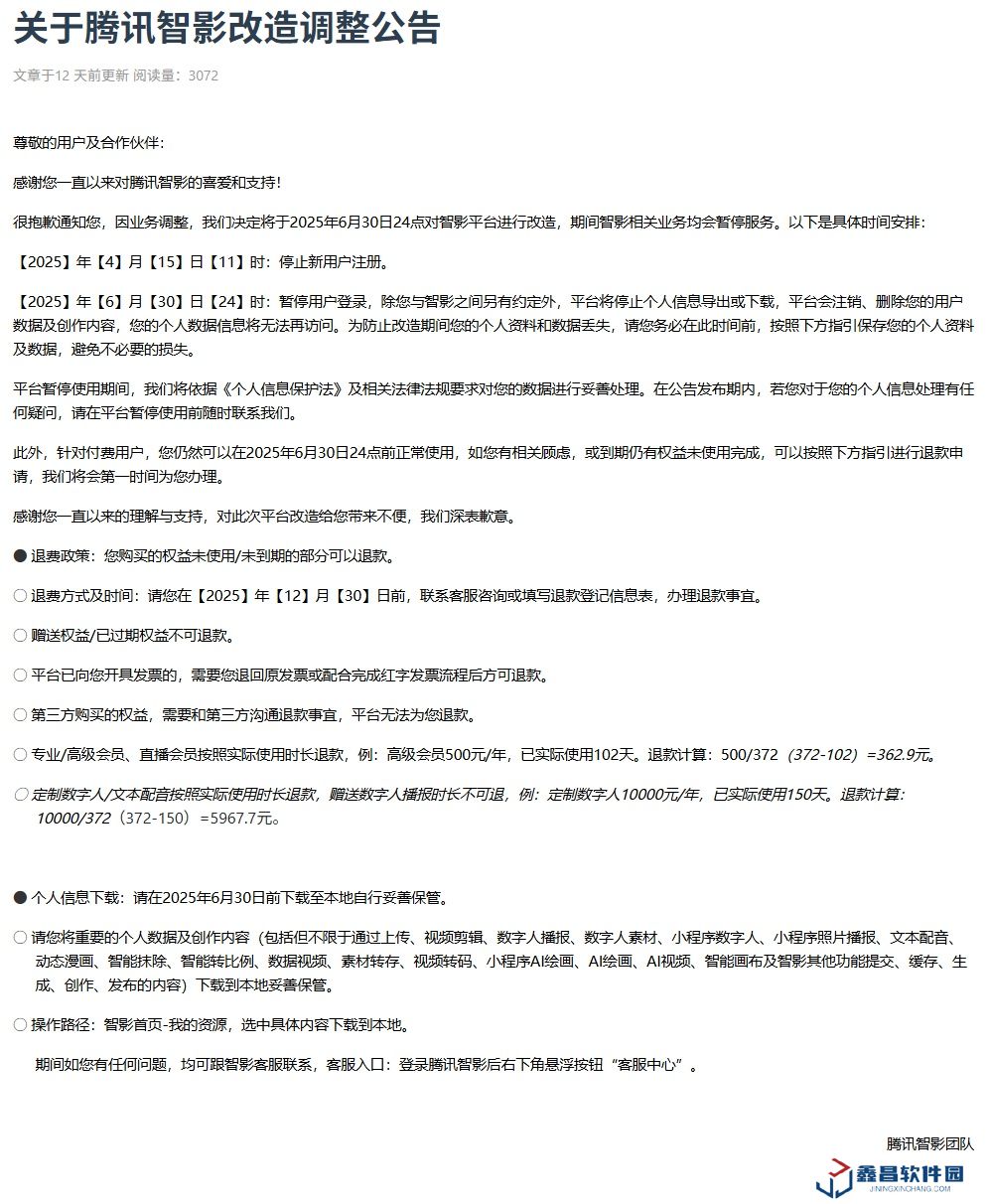 - 騰訊智影宣布 6 月 30 日起改造,期間相關業(yè)務暫停服務