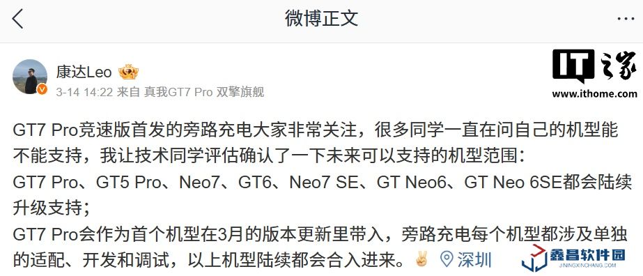 本站注意到,realme UI 產(chǎn)品經(jīng)理@康達(dá)Leo 本周發(fā)文稱,GT7 Pro、GT5 Pro、Neo7、GT6、Neo7 SE、GT Neo6、GT Neo 6SE 都會陸續(xù)升級支持旁路充電。