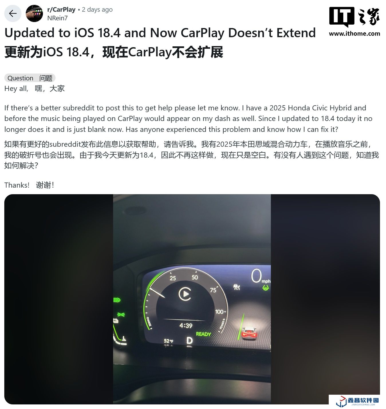 蘋果 iOS 18.4 系統(tǒng)本周推送后,Reddit 等平臺涌現(xiàn)大量投訴。用戶升級后發(fā)現(xiàn) CarPlay 出現(xiàn)多種故障,最普遍的問題是車載儀表盤無法同步顯示音樂播放信息。本站附上截圖如下: