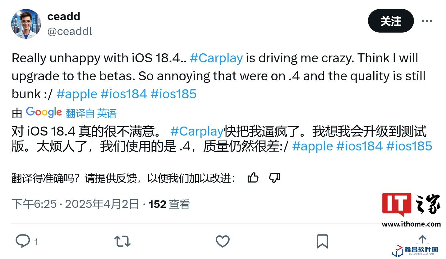 - 部分 iPhone 用戶反饋升級 iOS 18.4 后,遇到 CarPlay 功能異常