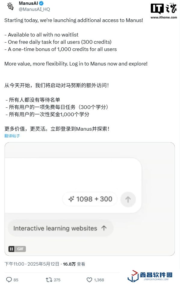 本站 5 月 13 日消息,價格曾經(jīng)炒到 10 萬,一碼難求的 AI 智能體平臺 Manus(https://manus.im/)今日突然宣布開放注冊。