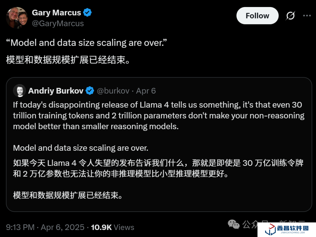 而 Llama 4 的慘淡表現(xiàn),也讓 NYU 教授馬庫斯寫出長文,斷言 Scaling 已經(jīng)結(jié)束,LLM 仍然無法推理。
