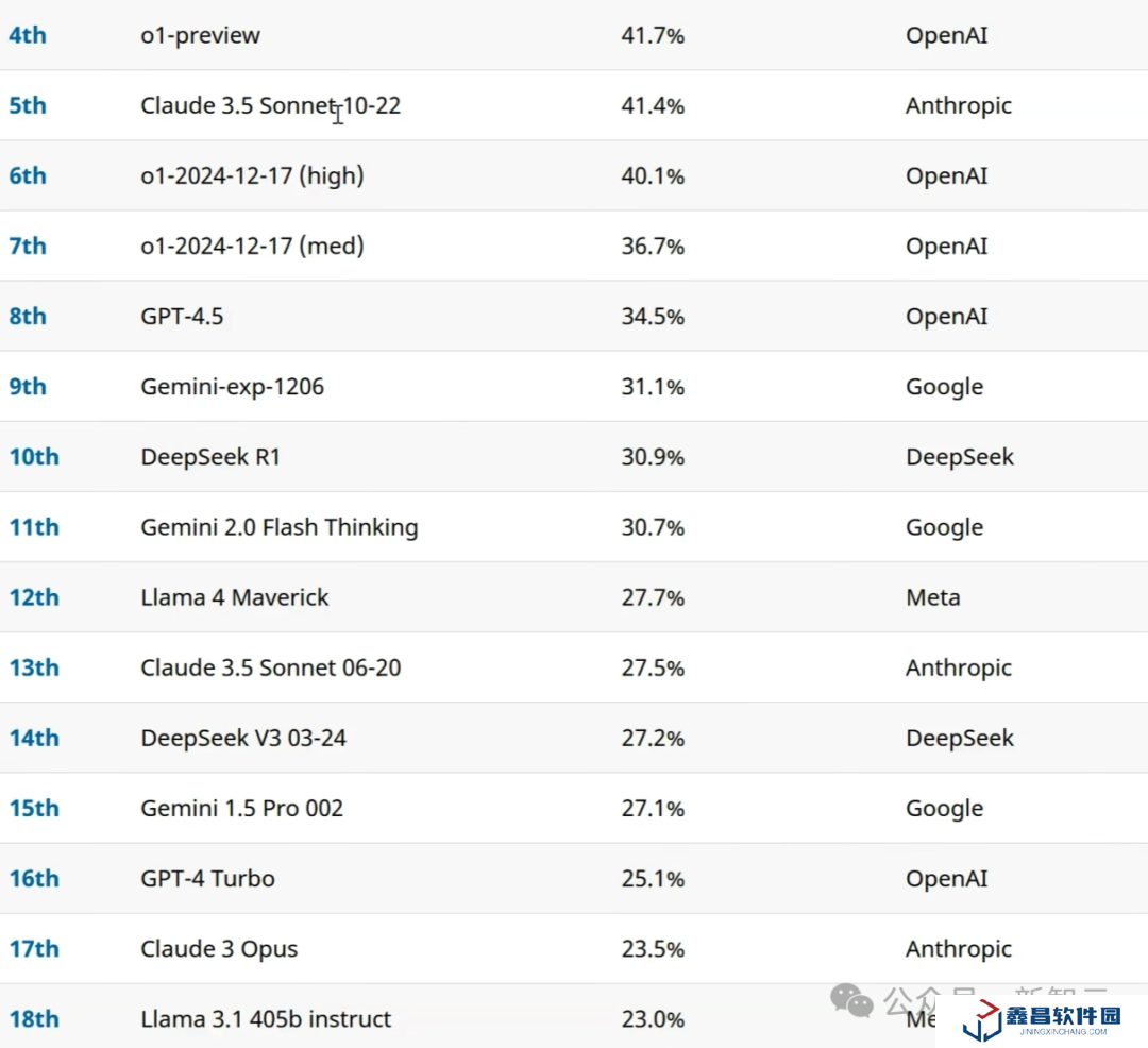 還有在 Simple Bench 中,Llama 4 Maverick 的得分大概為 27.7%,跟 DeepSeek V3 處于同一水平,還低于 Claude 3.5 Sonnet 這類非思維模型。