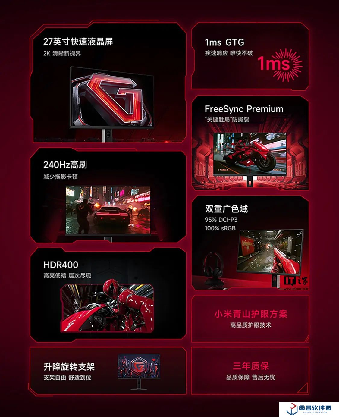 本站注意到,這款顯示器采用 27 英寸 Fast IPS 面板,具備 2K 分辨率、240Hz 刷新率、1ms GTG 響應(yīng)時間、95% DCI-P3 色域及 100% sRGB 色域,支持 HDR400、FreeSync Premium,還有小米青山護眼功能。