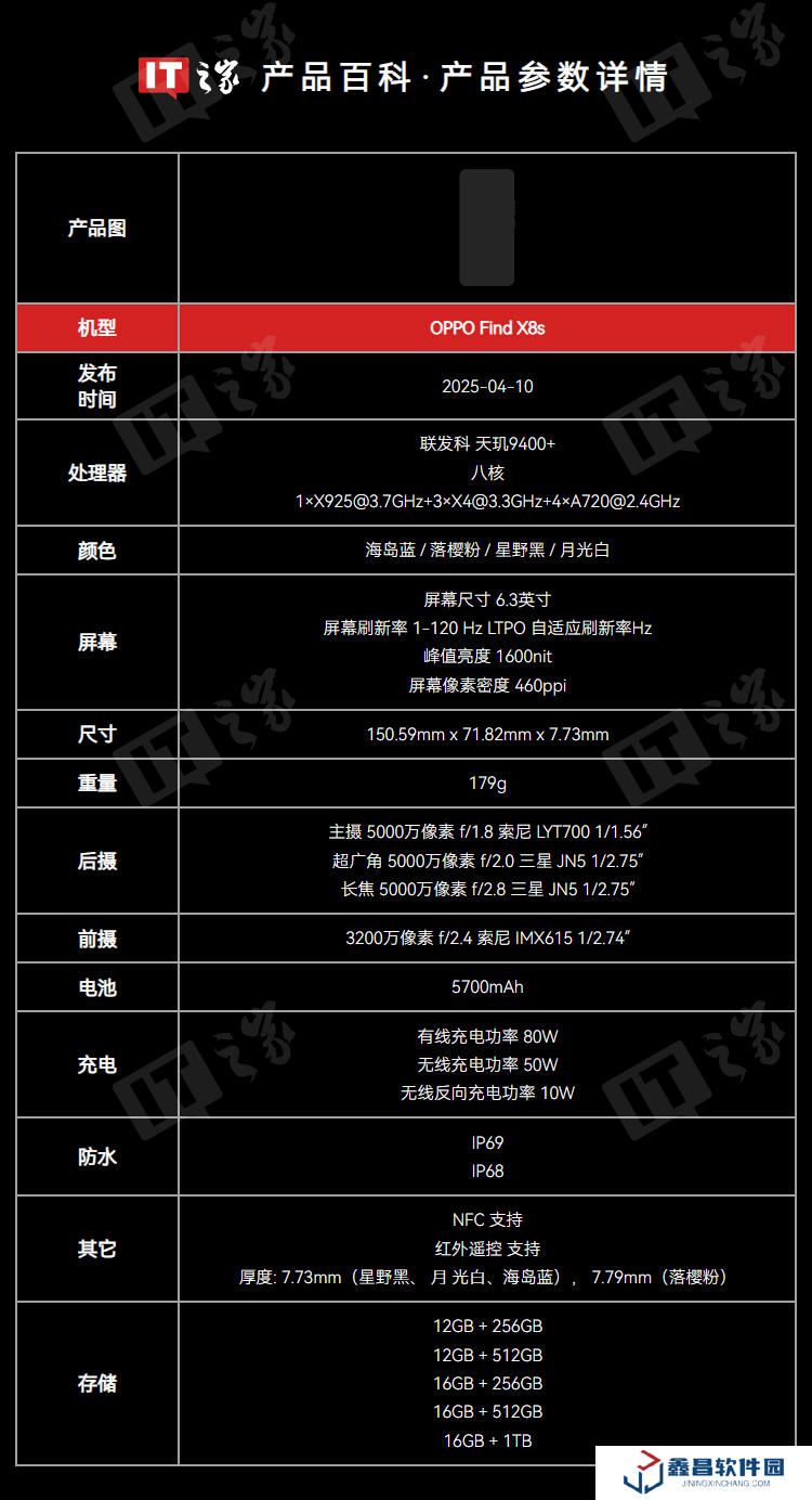 OPPO Find X8s 的長寬分別為 150.59mm、71.82mm,厚度則僅為 7.73mm(月光白),重量僅為 179g。