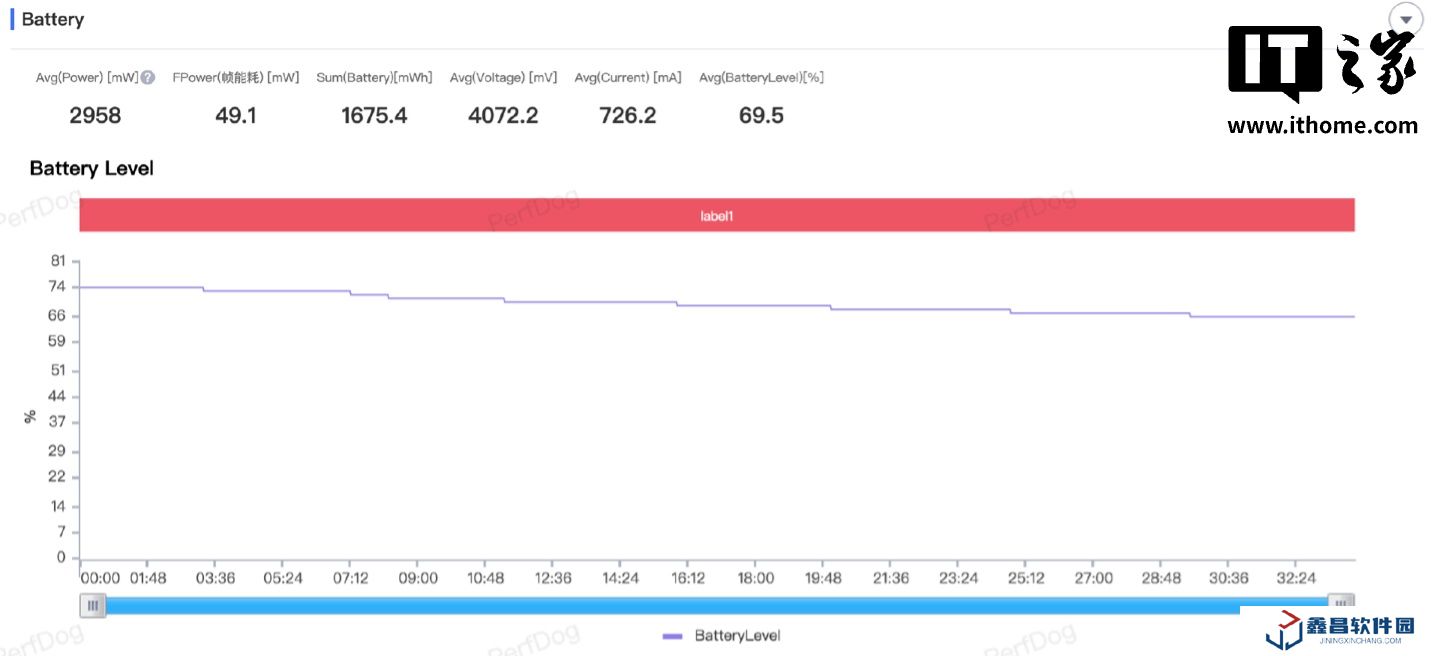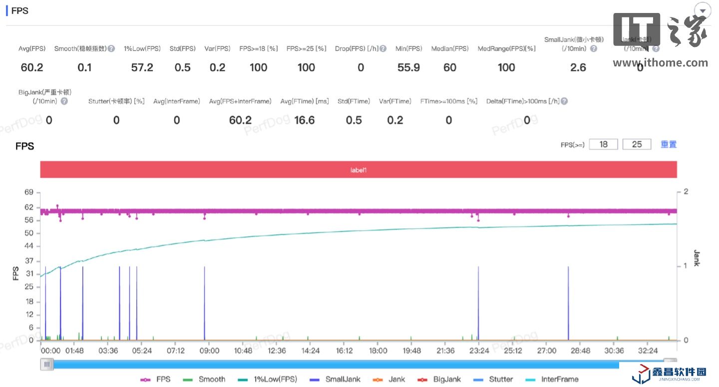 如下圖所示,30 分鐘的測試中,OPPO Find X8s 幀率幾乎滿幀,幀率波動的情況極少,沒有任何掉幀、卡頓的情況發(fā)生,非常穩(wěn)定。