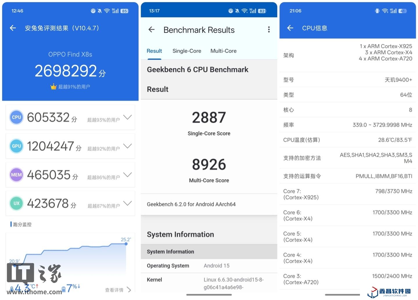 核心配置上,OPPO Find X8s 行業(yè)首發(fā)聯(lián)發(fā)科天璣 9400+,作為天璣 9400 的升級版,也是目前聯(lián)發(fā)科陣營最強的 SoC,其延續(xù)了臺積電 3nm 工藝制程和全大核架構(gòu)設(shè)計。