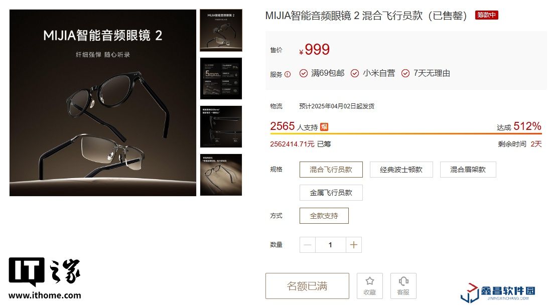 本站 3 月 31 日消息,小米 MIJIA 智能音頻眼鏡 2 于 3 月 26 日開啟眾籌,小米有品眾籌價 999 元,小米有品顯示四種款式均名額已滿。