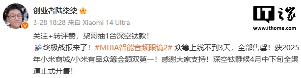 蜂巢科技合伙人@創(chuàng)業(yè)者陸柒柒 透露,該產(chǎn)品眾籌上線不到 3 天全部售罄,獲 2025 年小米商城 / 小米有品眾籌金額雙第一,深空鈦靜候 4 月中下旬全渠道正式開售。