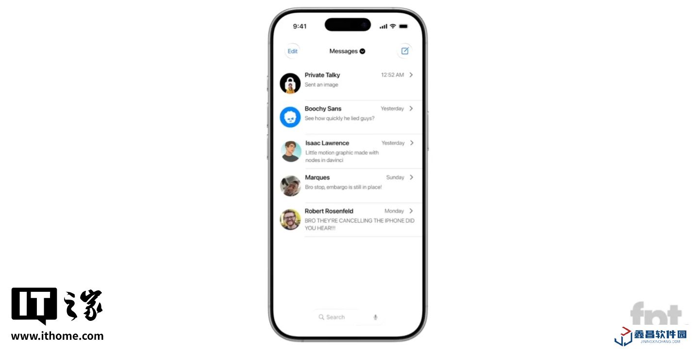 然而,根據科技博主 Jon Prosser 的爆料,iOS 19 將對應用內搜索欄的位置進行調整。據稱,iOS 19 將把應用內的搜索欄移至屏幕底部,這一改變將使用戶能夠更自然地使用拇指進行操作。Prosser 在其最新視頻中展示了這一改動的模擬效果,以信息(Messages)應用為例,目前該應用的搜索欄位于頂部,需要下拉才能顯示;而在 iOS 19 中,搜索欄將始終可見,并且位于屏幕底部,方便用戶隨時使用。
