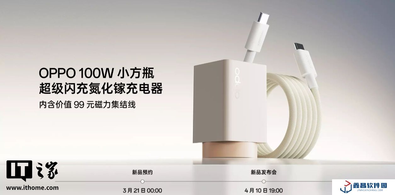 本站 4 月 8 日消息,OPPO 100W 小方瓶超級閃充氮化鎵充電器今日開啟預熱,新品采用“前圓后方”的設計,可配合磁力集結線使用,4 月 10 日發(fā)布。