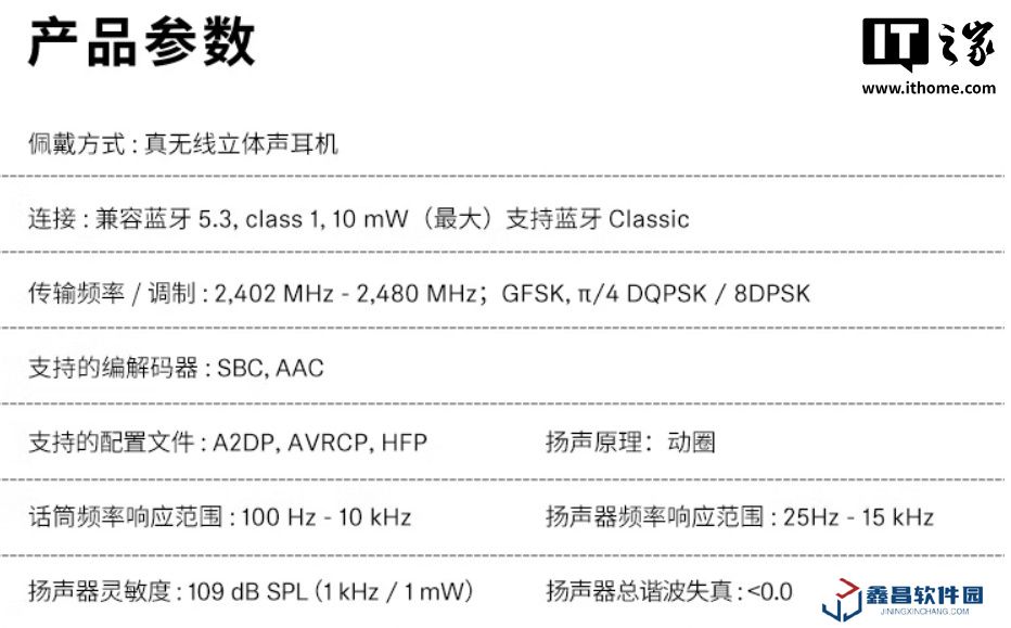 該耳機(jī)采用半入耳技術(shù),搭載動(dòng)圈單元,通過 AI 聲音拾取提升通話質(zhì)量;搭載藍(lán)牙 5.3,支持 SBC、AAC 編解碼。