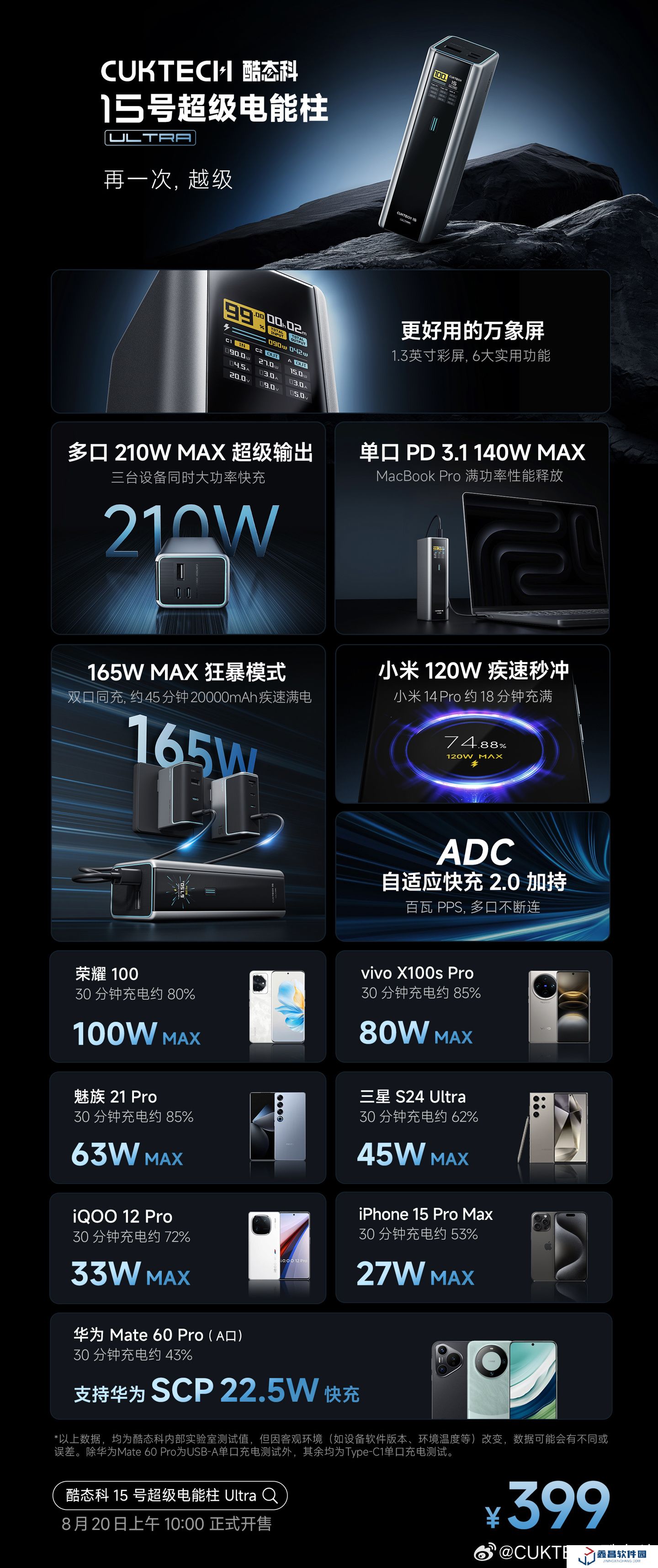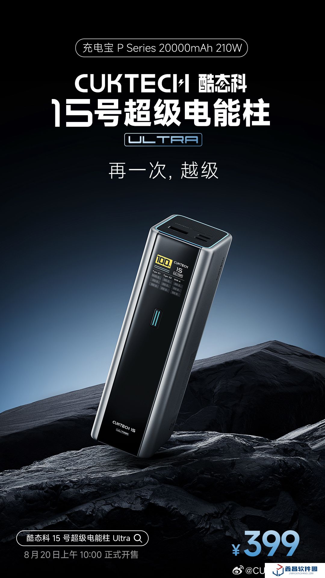 酷態(tài)科 15 號(hào)超級(jí)電能柱 Ultra 充電寶開(kāi)售于去年 8 月 20 日,20000mAh、多口至高輸出 210W。