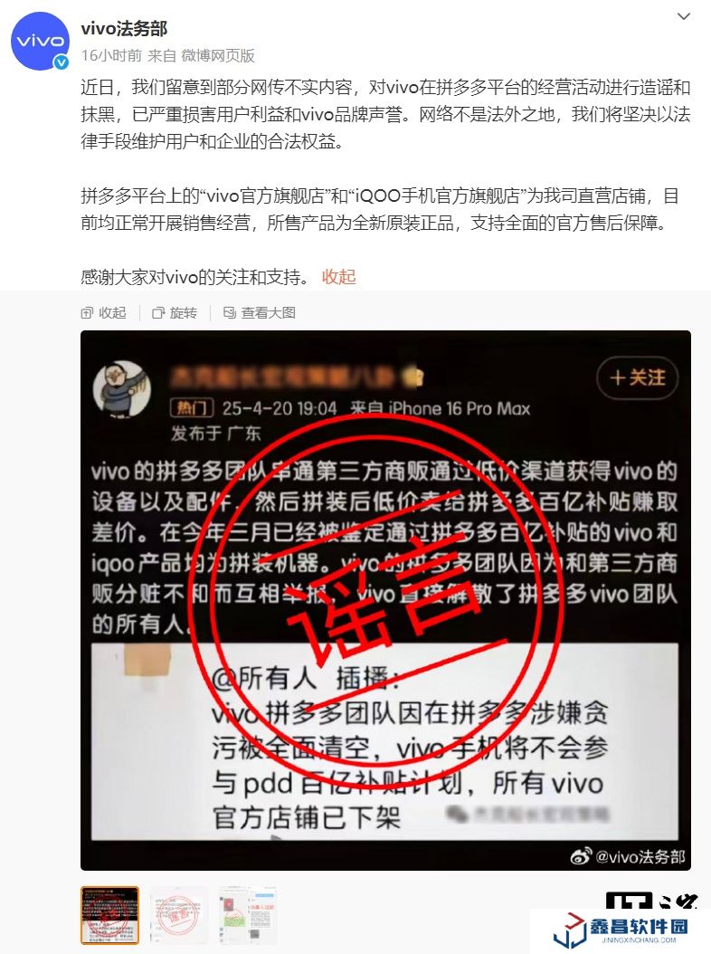 本站 4 月 22 日消息,近日網(wǎng)傳 vivo 公司因此前原有拼多多團隊被舉報貪腐,導(dǎo)致被百億補貼下架,無法正常經(jīng)營。對此,vivo 法務(wù)部昨日回應(yīng)稱,這是對 vivo 在拼多多平臺的經(jīng)營活動進行造謠和抹黑,已嚴(yán)重損害用戶利益和 vivo 品牌聲譽。網(wǎng)絡(luò)不是法外之地,我們將堅決以法律手段維護用戶和企業(yè)的合法權(quán)益。