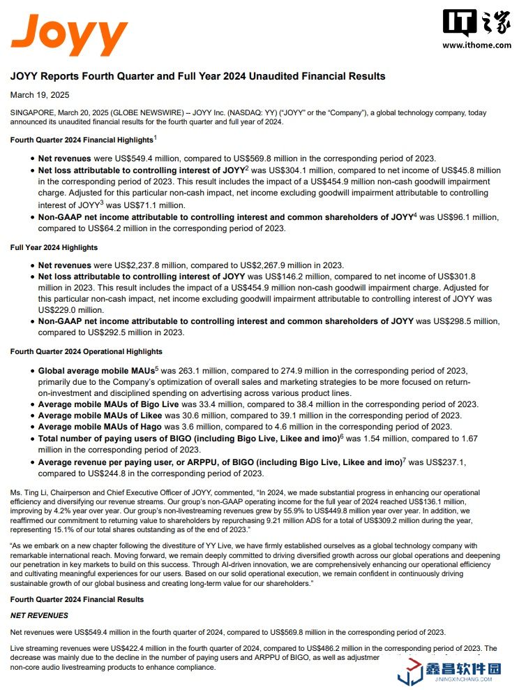本站 3 月 20 日消息,歡聚集團(tuán)今日發(fā)布了 2024 年第四季度及全年財(cái)報(bào)。