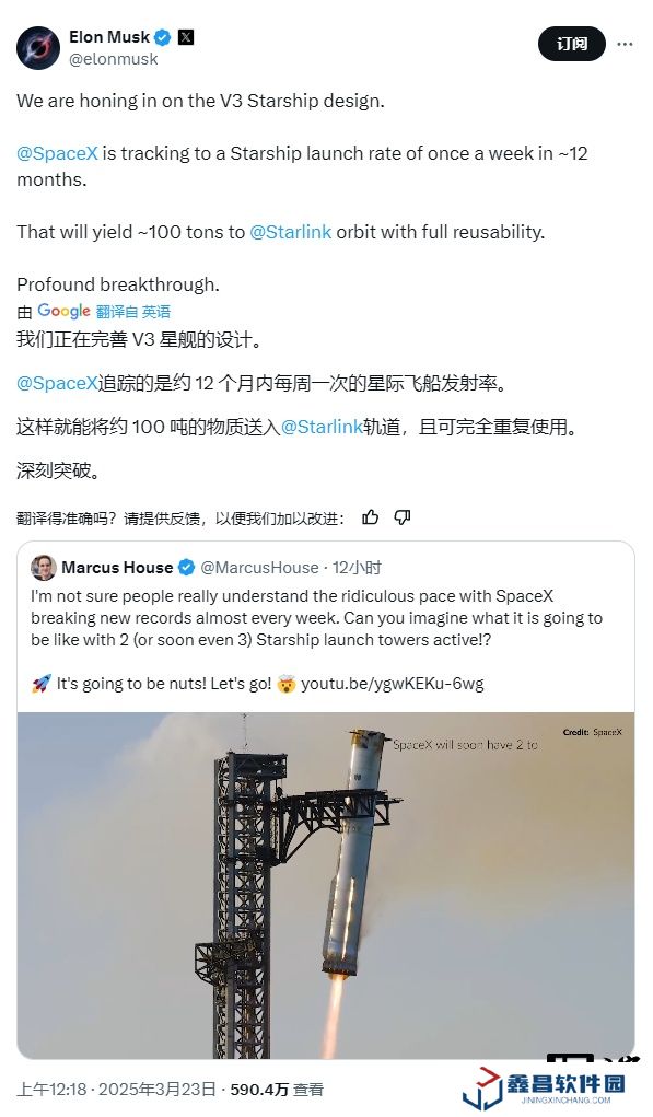 本站 3 月 23 日消息,SpaceX 創(chuàng)始人埃隆?馬斯克在社交平臺(tái) X 上發(fā)文公布了關(guān)于公司星艦的進(jìn)展,他表示正在完善 V3 版本星際飛船的設(shè)計(jì),預(yù)計(jì)在約 12 個(gè)月內(nèi),星艦的發(fā)射頻率將達(dá)到每周一次。并且在完全可重復(fù)使用的情況下,每次能將約 100 噸物資送往星鏈(Starlink)軌道。馬斯克稱(chēng)這是一個(gè)重大突破。
