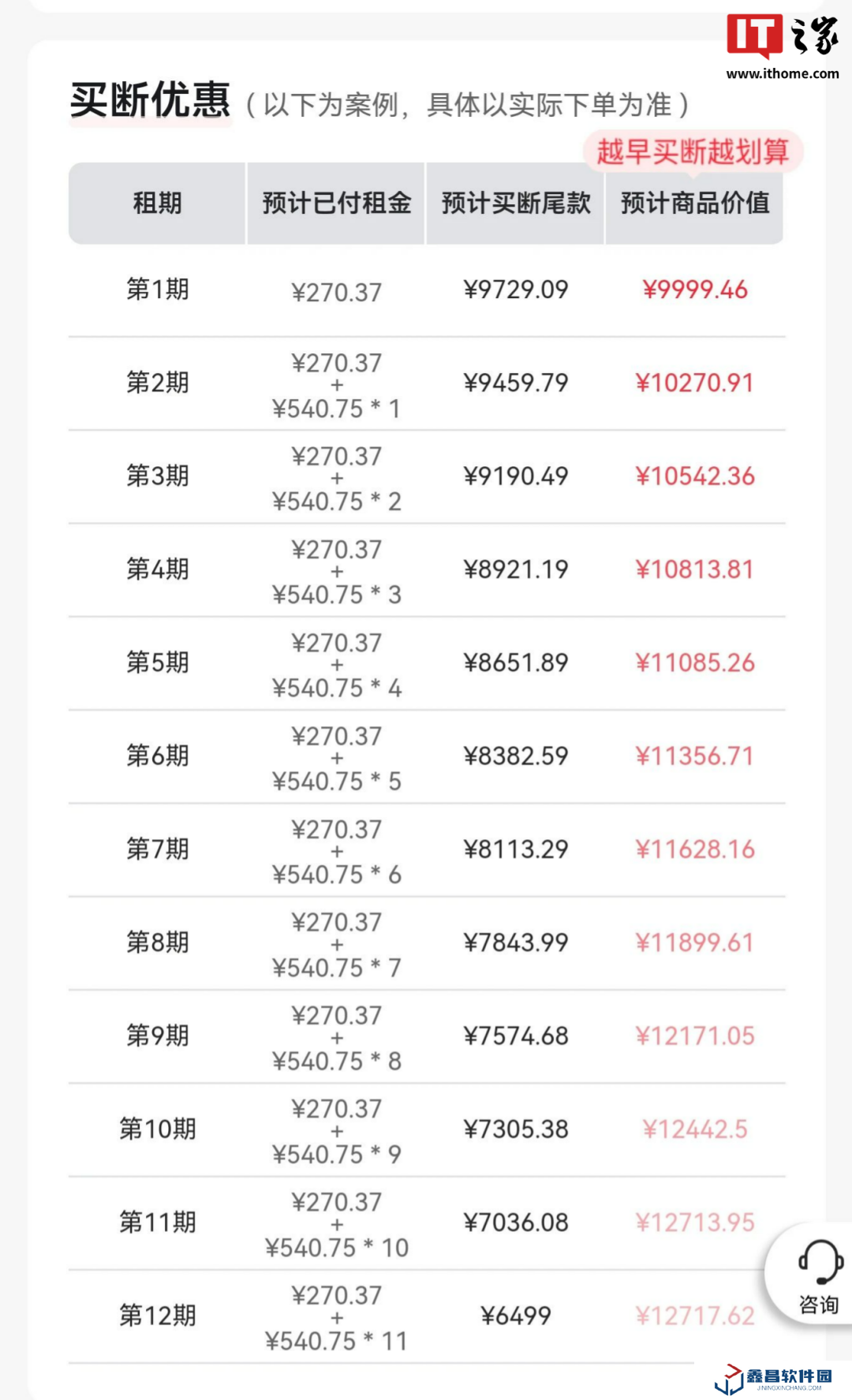 一年期滿后,可以買斷手機,價格為 6499 元,租金 + 買斷共計達到 12700 元。