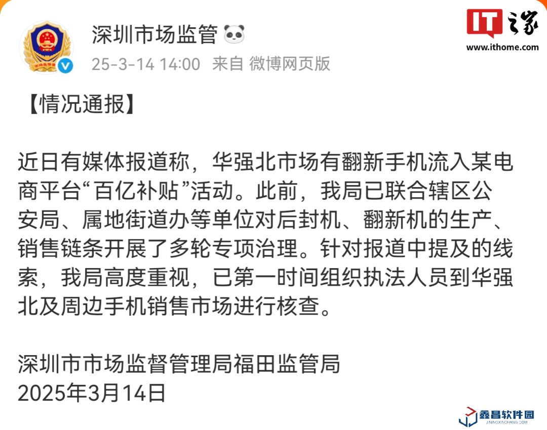 而就在 3 月 14 日,針對后封機翻新機亂象,@深圳市場監(jiān)管 發(fā)布通報,稱“已第一時間進行核查”。